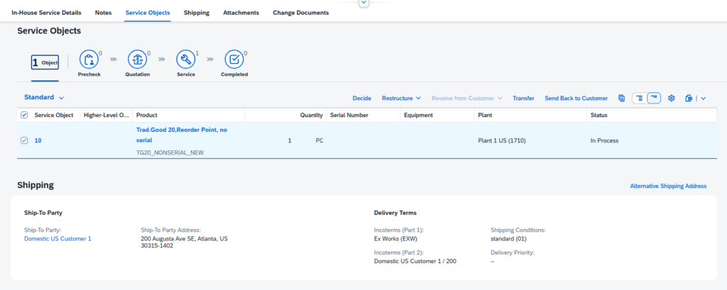 Die Anlieferung der Reparaturobjekte (Equipment) über eine Anlieferung oder über die erweiterte Retoure, sowie der Transfer der Reparaturobjekte zwischen den Werken und die Anzeige von Bestandsinformation über die Reparaturobjekte sind integriert. Der Sonderbestand “Kundenbestand (B)” kann für die Bestandsführung der Kunden-Reparatur-Equipments genutzt werden. Die logistischen Prozesse für Anlieferungen und Transfer sind in einem separaten Belegfluss dargestellt, sodass die Übersicht über den Prozess erhalten bleibt. Mit der Funktion “Restructure” können Serviceobjekte in der Reparatur aufgeteilt oder zusammengeführt werden.